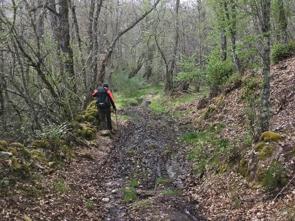 Während des Wegs aus Requejo blies weiterhin ein kalter Wind aber es blieb trocken. Doch bald im Aufstieg zum 1‘352 m hohen Pass begann es zu regnen. Mit Treckingschirm und Regenschutz über dem Rucksack ging es für mich dann höher und höher hinaus. Mikel hatte zum Schutz vor dem Unwetter nur eine Regenjacke an.