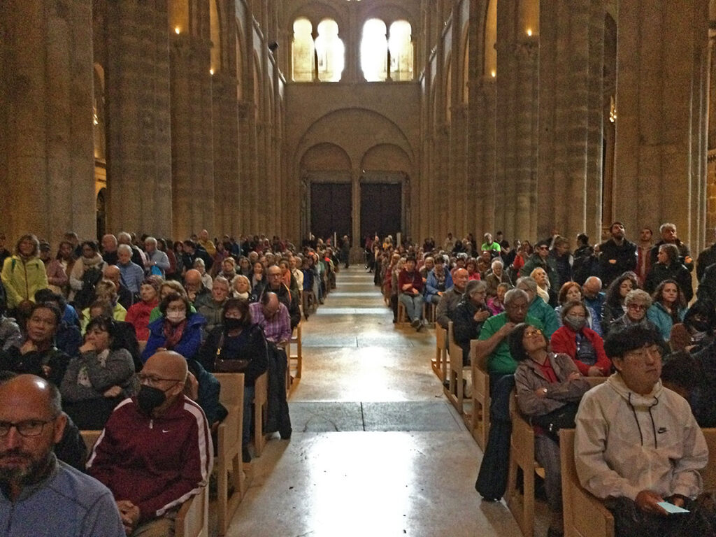 Die knapp einstündige Pilgermesse hat mich enttäuscht. Die Nonne mit der wunderbaren, weittragenden Stimme, die früher vor der Pilgermesse die Lieder vorgestellt hat, die dann gemeinsam gesungen wurden, gab es heute nicht, gemeinsam gesungene Lieder auch nicht. Die Messe selbst hat mich nicht gefesselt. War es die Messe selbst, der die Energie fehlte, oder fehlte sie mir nach der vielen Lauferei?
