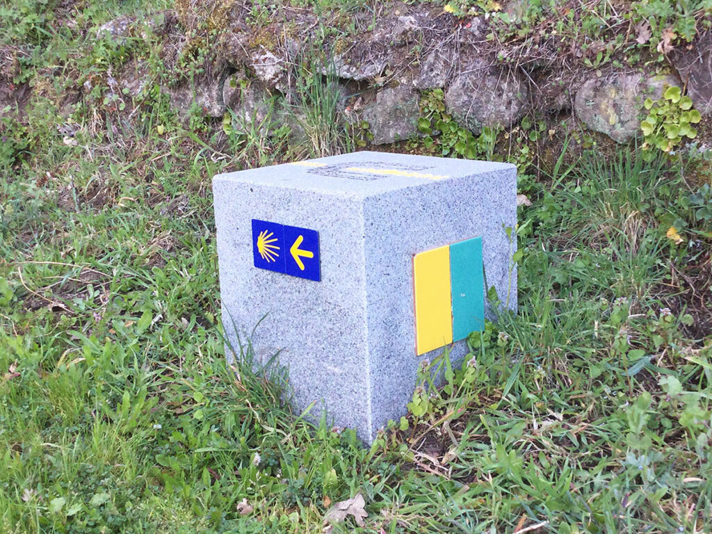 Moderner Wegweiser für Jakobspilger. Die Farben auf den Kacheln beschreiben den Zustand des alten Handelswegs: gelbe Kachel, gut zu gehen; grün-gelbe Kachel, der Weg folgt dem Verlauf der Römerstrasse
