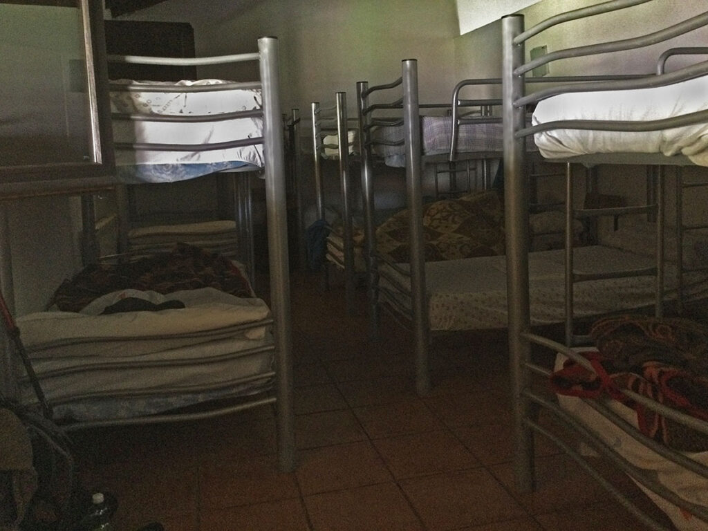 Blick in einen mit Doppelstockbetten zugestellten Schlafraum